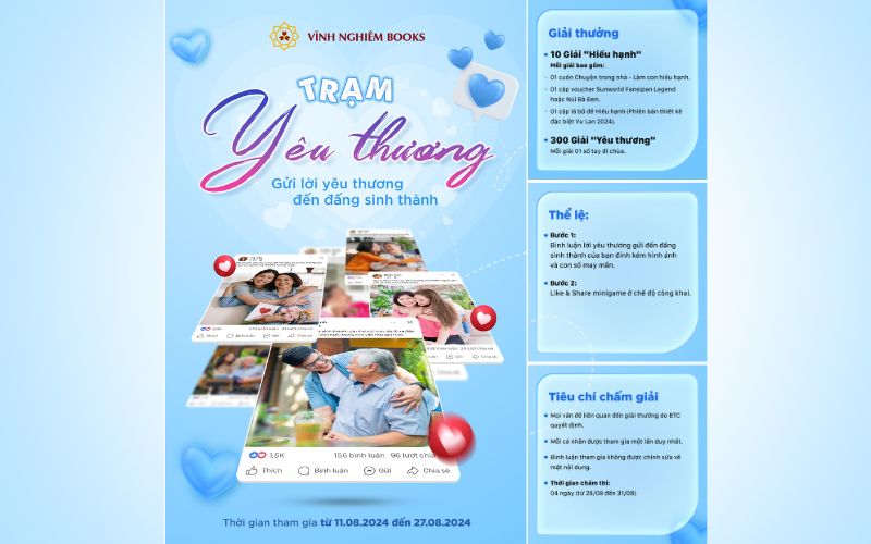 Tham gia ngay Minigame Trạm Yêu Thương của Vĩnh Nghiêm Books từ ngày 11/08/2024 đến 27/08/2024 để thể hiện lòng hiếu thảo với đấng sinh thành và nhận ngay những…